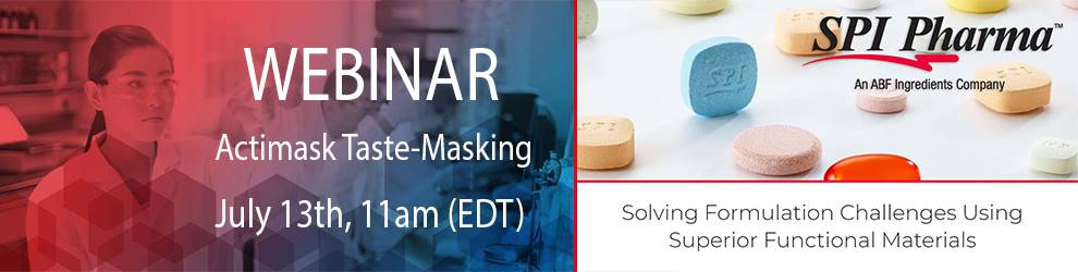 Discover Actimask, a unique and effective Taste-Masking Solution from SPI Pharma. Learn more about this technology in an exclusive webinar titled, “Actimask Taste-Masking, The Key to Making Patients Better - Without the Bitter!” on Tuesday, July 13th at 11:00 am (EDT). Estimated webinar duration is 45 minutes.